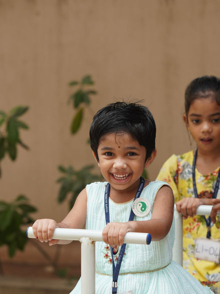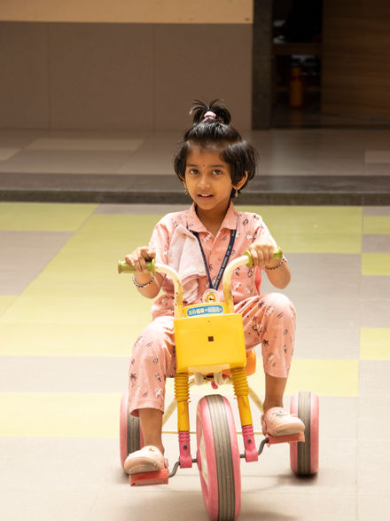 Our KG classes enjoy access to an outdoor sanded play area equipped with swings, slides, and jungle gyms, providing ample opportunities for active play and exploration. Additionally, they delight in our splash pool, where they can splash around with buckets, bowls, and water toys. Indoors, they have access to play equipment like bats, balls, rocking horses, and cycles, fostering both free play and organized activities such as obstacle races during sports day.